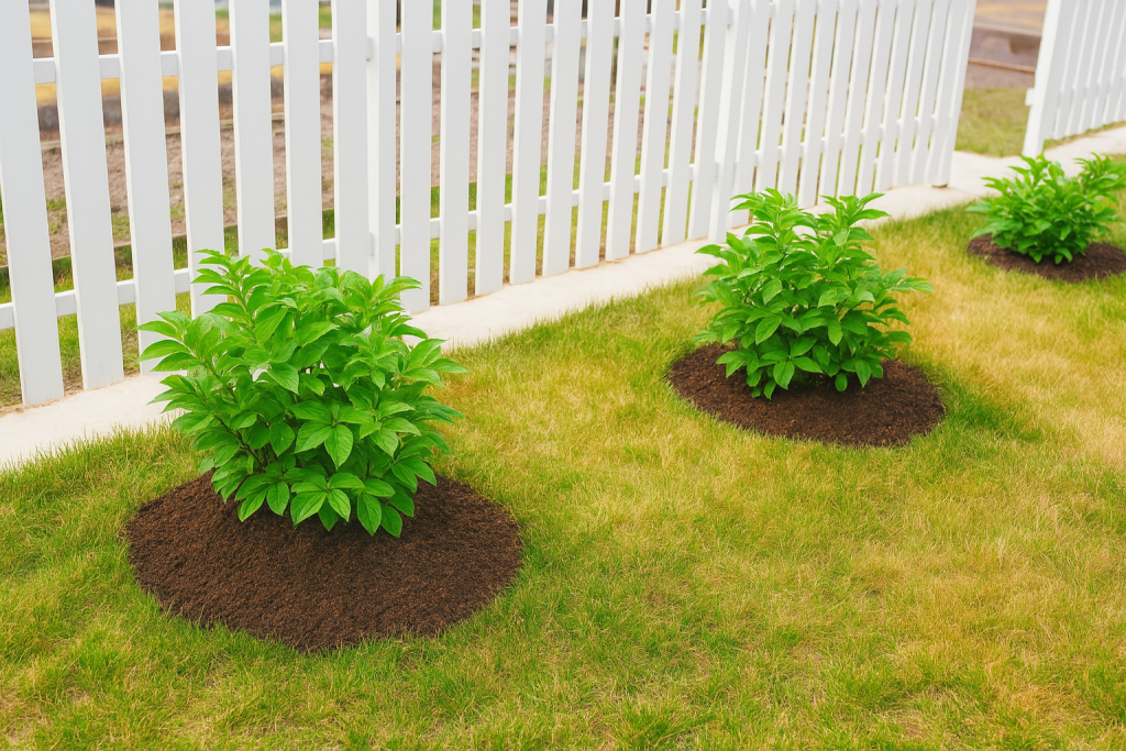 Så må du gjøre det viktigste av alt: fjern gress minst 50 cm ut fra stammen. Gress og plen rundt en nyplanta busk eller et tre er en av de største årsakene til at planten sliter eller dør. Gressrøtter konkurrerer aggressivt om vann, næring og oksygen – og stjeler bokstavelig talt livsgrunnlaget fra unge planter. Det holder ikke å bare stikke planten i plenen og håpe det går bra. Du må rydde plass. Lag en bar jord-sone rundt planten. Legg gjerne på et dekke av kompost, gressklipp, bark eller halm, slik at fuktigheten holder seg og ugress ikke overtar.